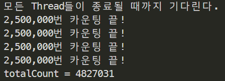 위의 실행 결과 totalCount 변수 안에는 10,000,000이 아니라 4,827,031이 들어가 있다는 것을 확인할 수 있다.