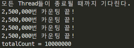 이 코드를 실행하면 4개의 Thread가 totalCount변수를 2,500,000번 더했으니 4 * 2,500,000인 10,000,000이 나와야 정상이다. 실행해보자.