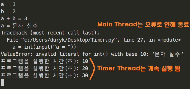 타이머가 Daemon인 위의 프로그램을 실행을 하다가 내가 실수로 a에 숫자가 아니라 문자를 넣어서 오류가 난 경우 어떻게 될까?