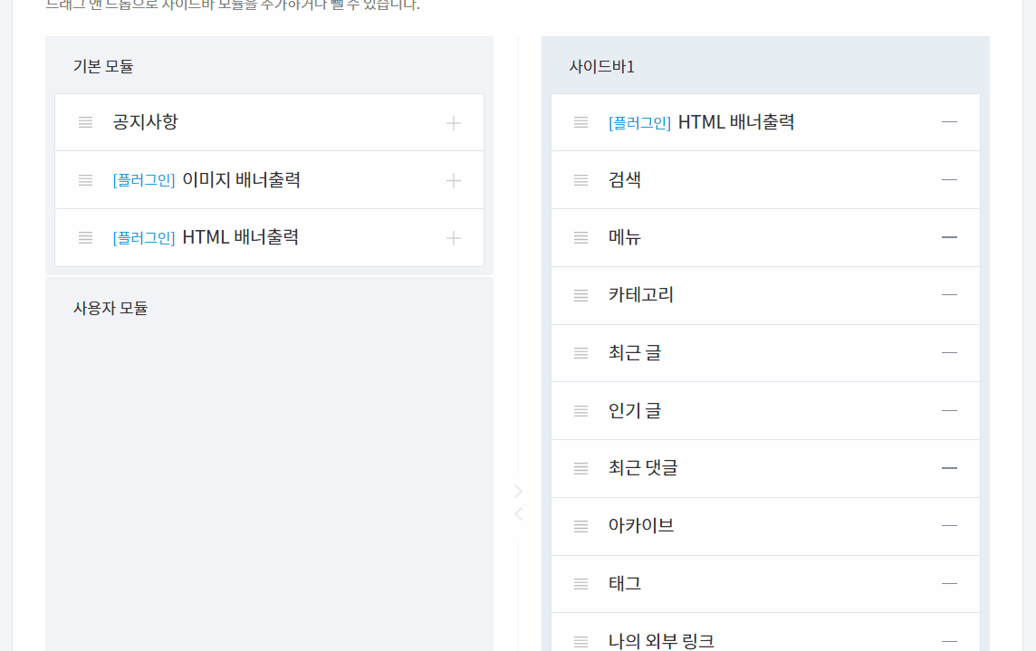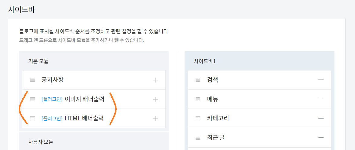 사이드바 페이지의 기본 모듈 카테고리에 [플러그인] HTML 배너출력이 있어야 한다.