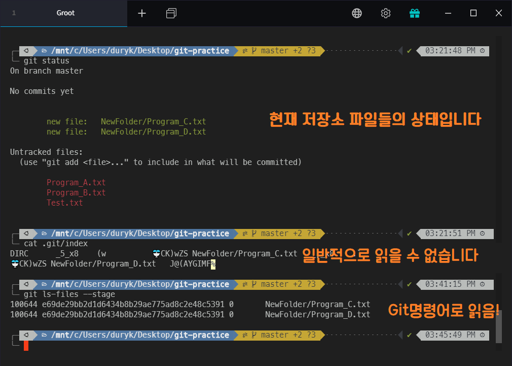 git ls-files --stage 명령어를 사용하면 index 파일을 Git이 잘 읽어줍니다. 결과를 보시면 현재 Commit하려고 추적 중인 파일인 Program_C.txt와 Program_D.txt 파일의 목록을 index가 가지고 있다는 것을 알 수 있습니다.