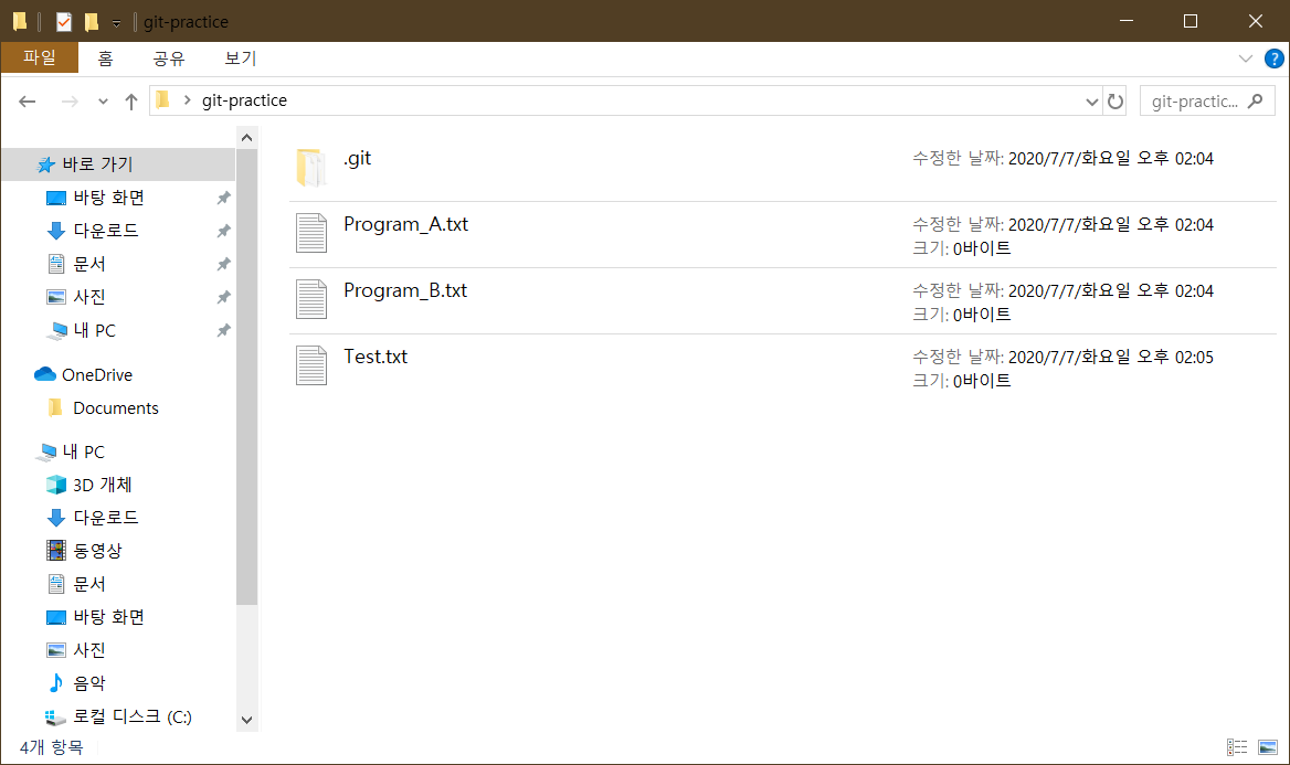 git-practice라는 Git 저장소를 만들었습니다. 그 저장소에 실제 프로그램인 Program_A.txt, Program_B 파일과 제가 임의로 여러 가지를 시도해보려고 만든 테스트용으로 만든 Test.txt 파일이 있습니다.