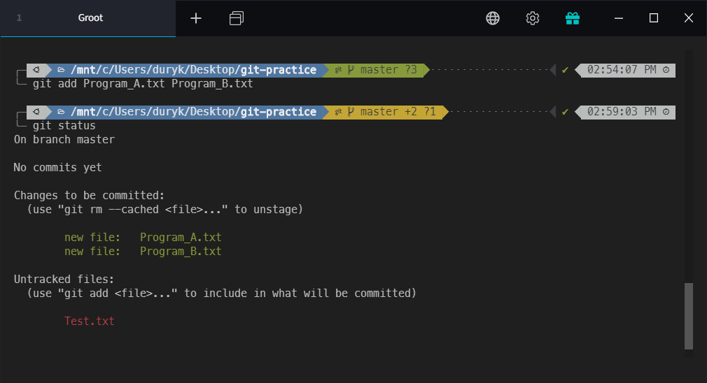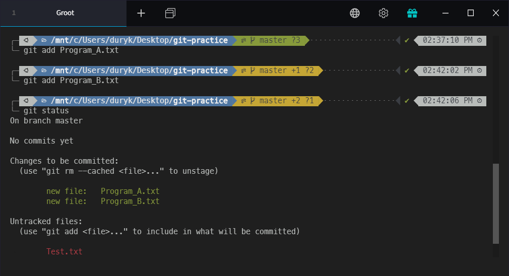 저는 테스트용으로 만든 Test.txt를 관리하고 싶지 않습니다. Program_A.txt와 Program_B.txt만 Commit하고 싶습니다. 그래서 Program_A.txt와 Program_B.txt만 Stage하겠습니다.