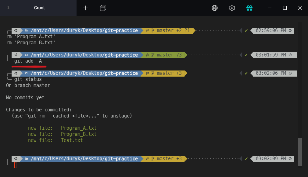 현재 Working Directory 아래의 모든 파일을 Stage하라는 명령어입니다. 현재 Working Directory가 Root(Git 저장소의 최상위 디렉터리, 즉 .../git-practice/)이면 git add -A와 동일한 역할을 합니다. 만약 현재 Working Directory에서 cd NewFolder를 해서 .../git-practice/NewFolder/이면 git add ./NewFolder/와 동일한 역할을 합니다.