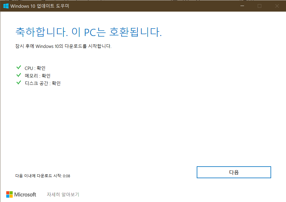 호환성 확인이 됐다면 이제 다음을 눌러서 업데이트를 진행하면 됩니다.