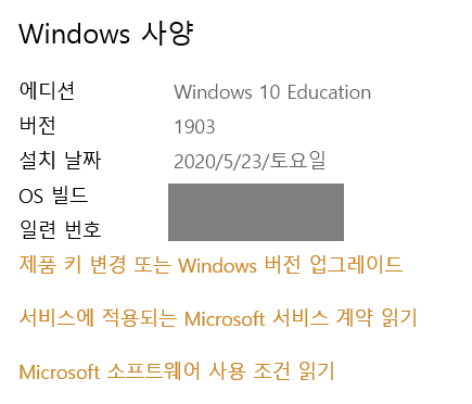 위에 사진을 보면 현재 제 Windows Edition은 Windows 10 Education이고 1903으로 구버전입니다.