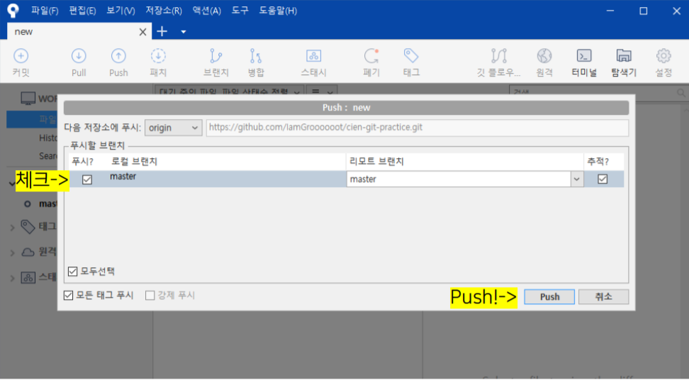 다시 Push클릭 후, main(또는 master) 브랜치 체크