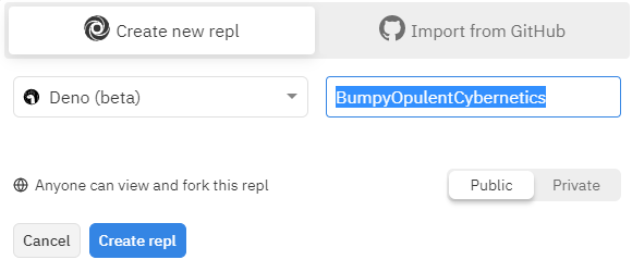 현재 replit.com에서 Deno 환경을 제공해주고 있다. 아직 beta버전이다. 만약에 한번 간단하게 사용해보고 싶다면 repl을 이용해봐도 좋을 것 같다.