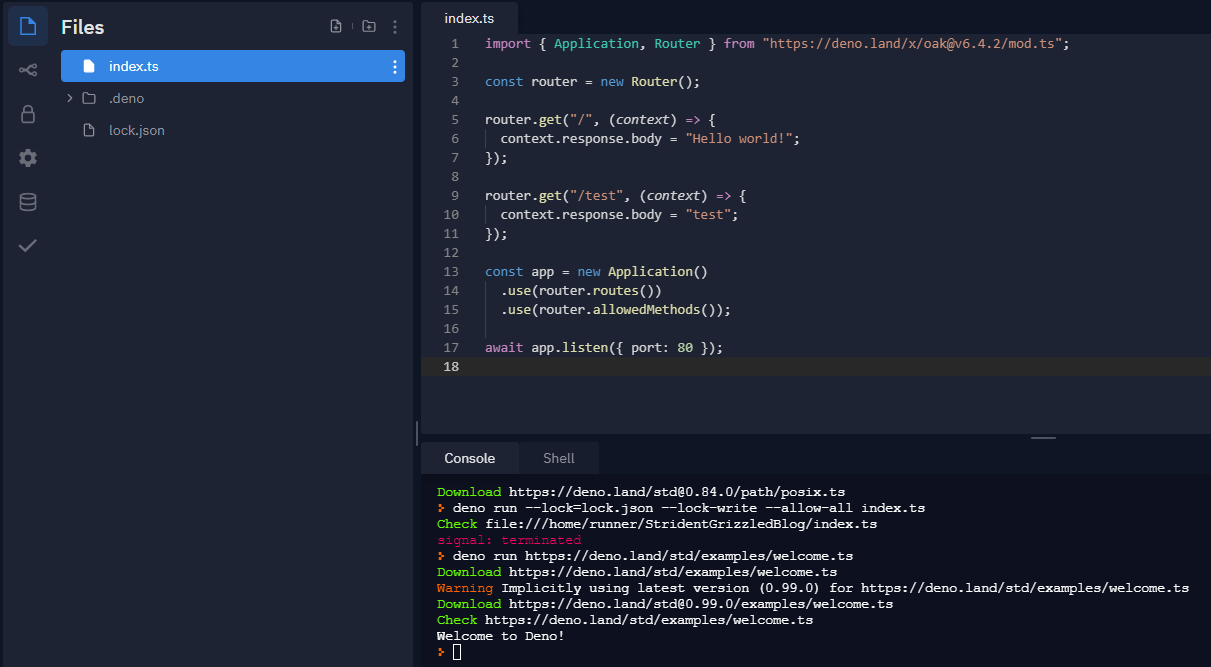 현재 replit.com에서 Deno 환경을 제공해주고 있다. 아직 beta버전이다. 만약에 한번 간단하게 사용해보고 싶다면 repl을 이용해봐도 좋을 것 같다.