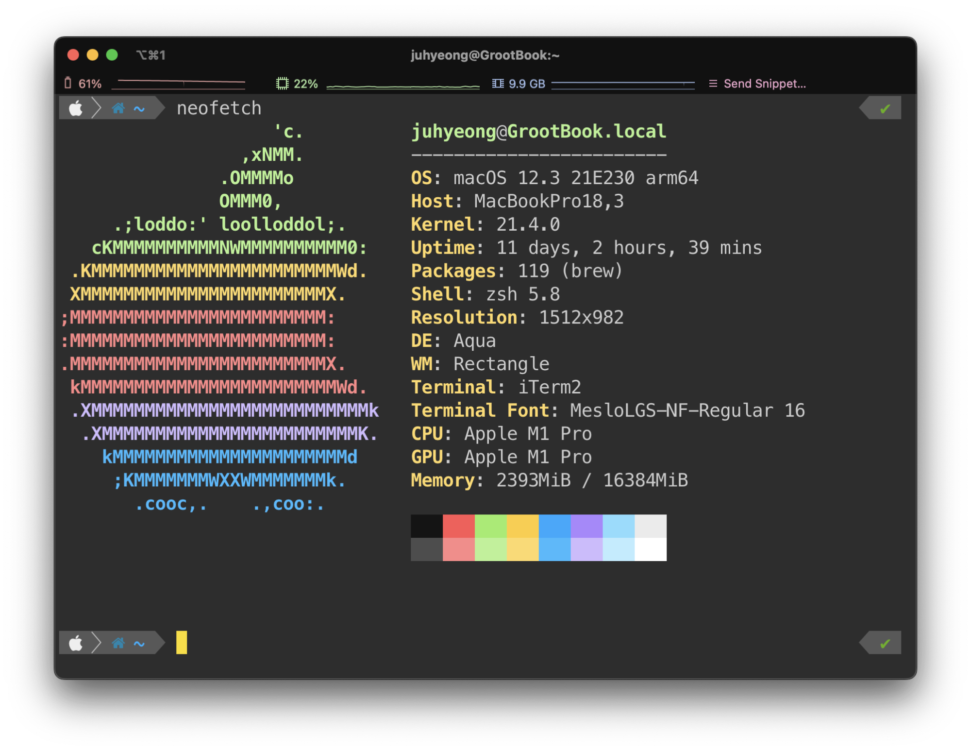 제 터미널 창을 보시면 상단에 "배터리, CPU, RAM" 상태와 SNIPPET을 실행시킬 수 있는 버튼을 둔걸 확인할 수 있습니다. 모두 iterm2에서 제공해주는 기능입니다. 그 외로 현재 보이는 창의 폰트나 투명배경이나 명령어 자동완성 기능 등도 터미널 에뮬레이터에서 제공해주는 기능입니다. 직접적으로 OS에 명령을 내리고 그런 것은 아니지만 외관적인 부분을 이쁘게 꾸밀 수 있고 Shell의 환경변수 같은 것을 읽어서 작업할 때 편리하게 해주는 역할을 합니다.