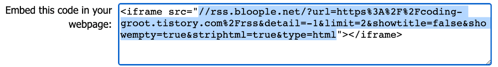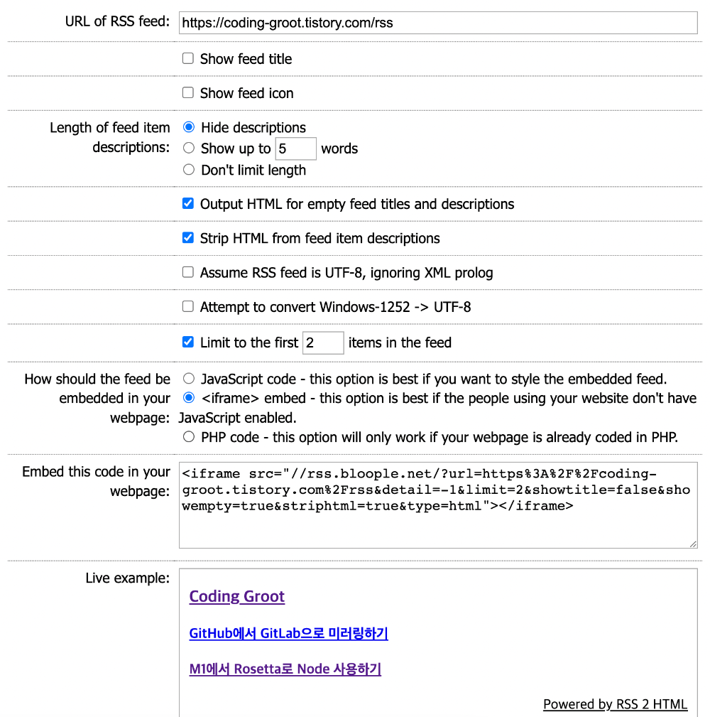 위 사이트에 내가 원하는 RSS 피드 URL을 넣고 원하는 옵션을 체크한 뒤에 Submit & Get Code 버튼을 누르면 iFrame 태그를 생성해준다.