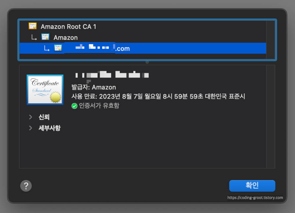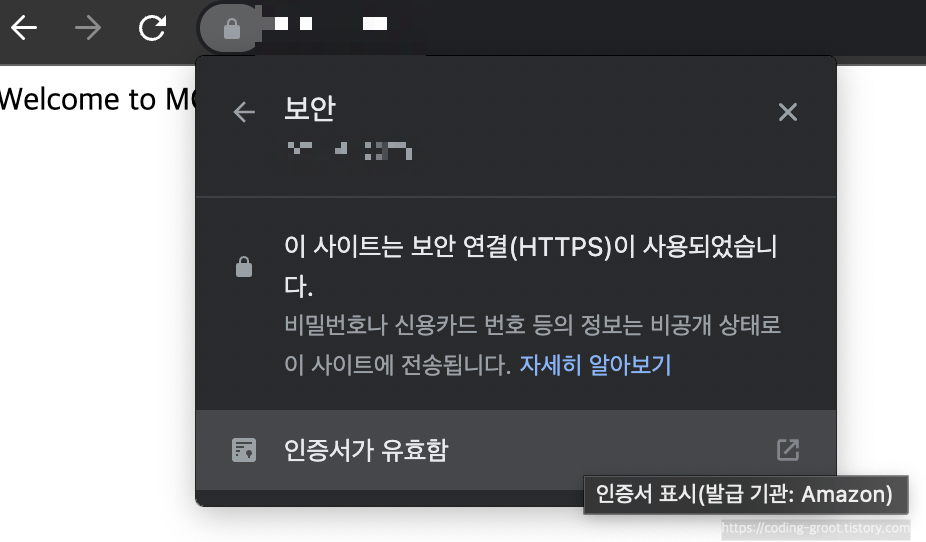 성공하면 다음과 같이 HTTPS로 접속했을 때 경고창이 없어야 하고 AWS에서 발급받은 인증서가 보여야 한다.
