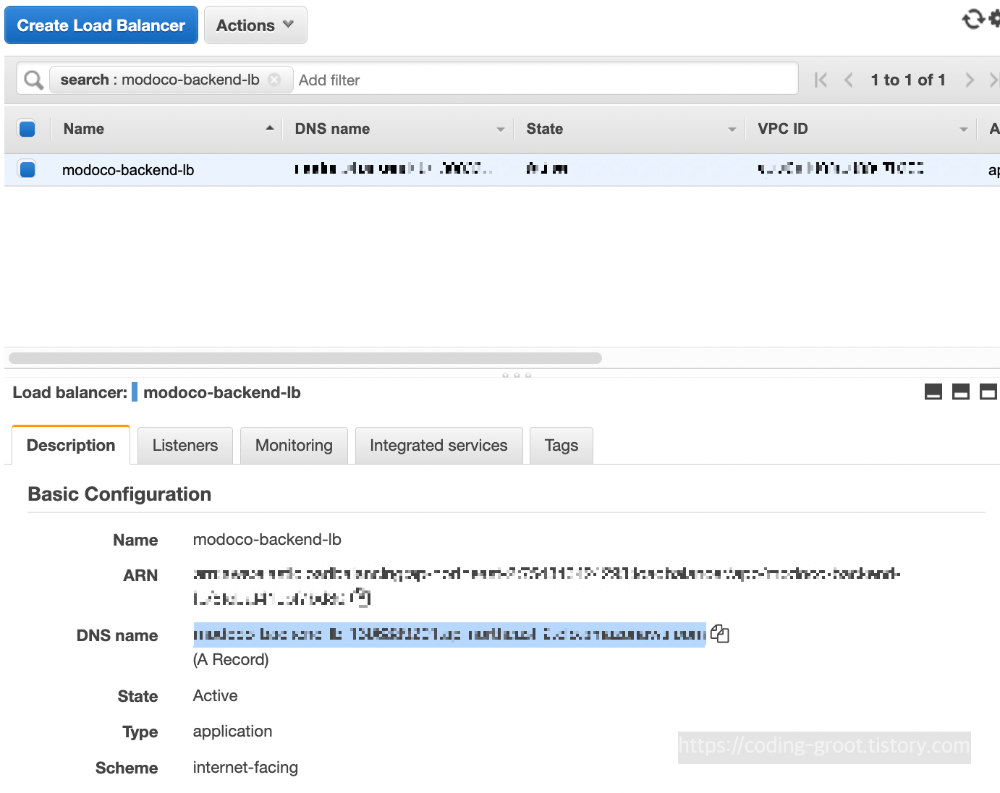 생성한 로드밸런서를 눌러보면 DNS name이라는 것이 보이는데 이게 곧 로드밸런서의 도메인 주소이다.