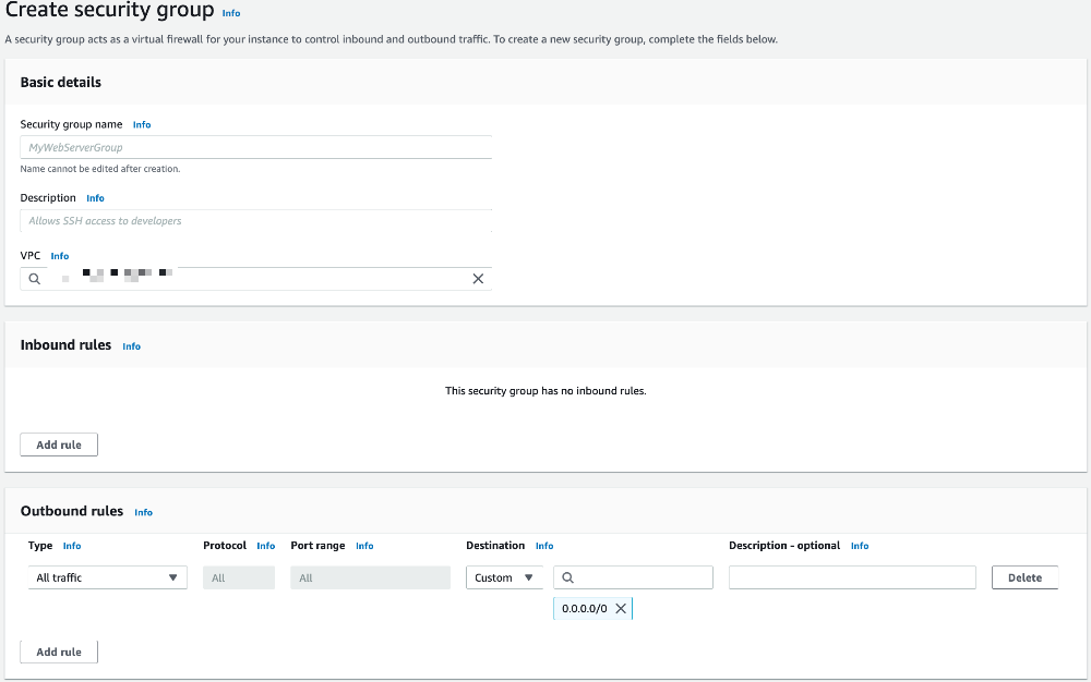 파란색으로 보이는 Create new security group을 눌러서 Security Group을 새로 생성해주자.