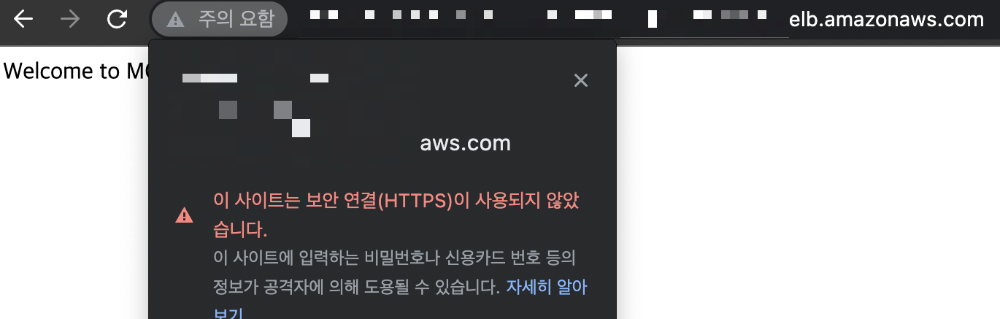 잘 작동하지만 내 인증서로 등록해준 도메인이 아니니 당연히 경고창이 뜬다.