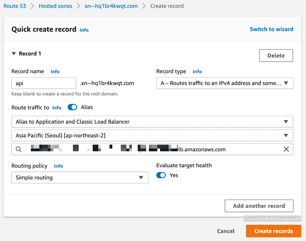 * 만약 Route53이 아닌 다른 곳에서 등록하고 있다면 A Record로 로드밸런서의 주소를 값으로 넣고 생성하면 된다.