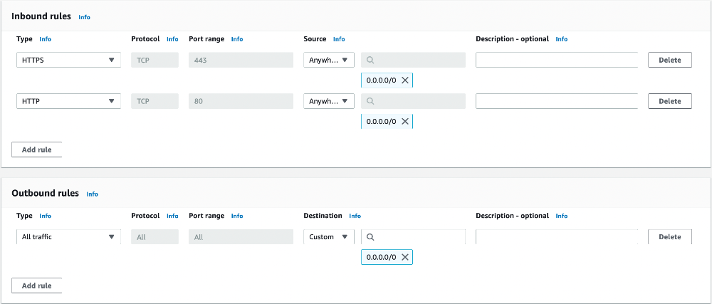 양방향으로 트래픽을 제어할 수 있다. 보통 보안 그룹을 생성하면 아웃바운드 규칙은 다 허용이 되어있다. 그리고 인바운드는 아무것도 생성이 안 되어 있어서 외부에서 트래픽을 받고 싶다면 인바운드 규칙을 뚫어주면 된다.