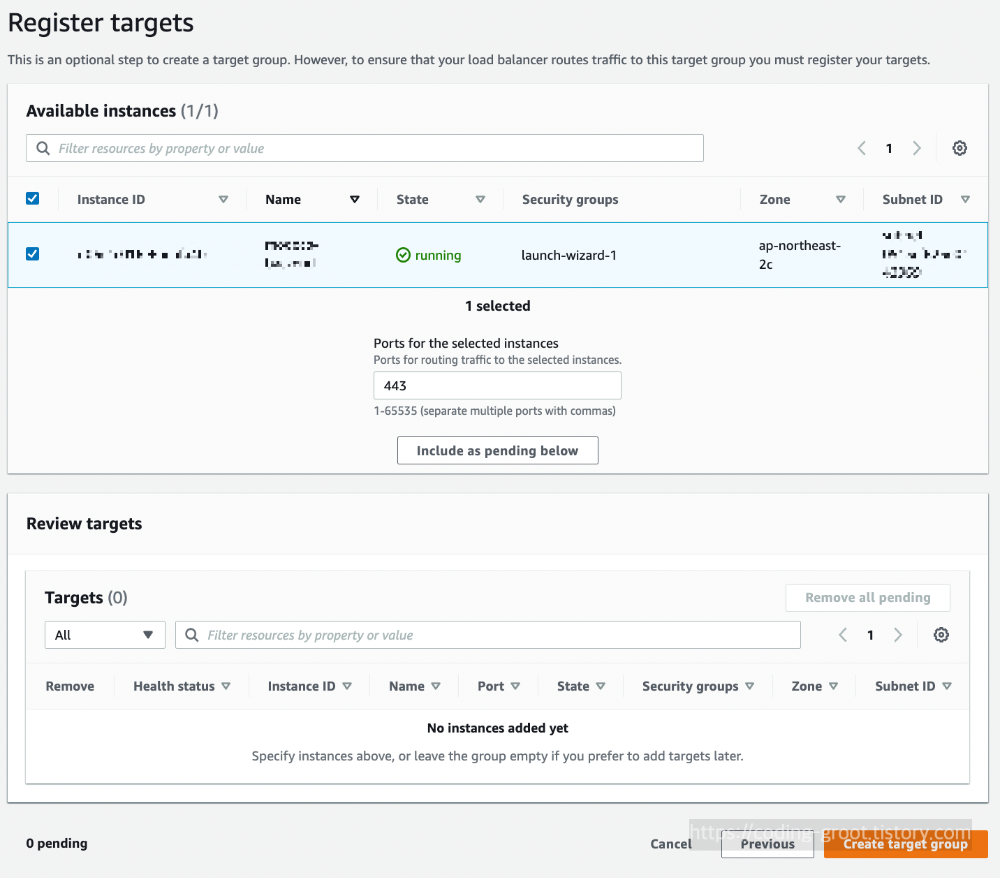 이때 인스턴스의 포트는 굳이 표준적인 80이나 443일 필요는 없다. LB가 해당 서버(인스턴스)와 통신할 때 사용할 것을 넣어주면 된다.