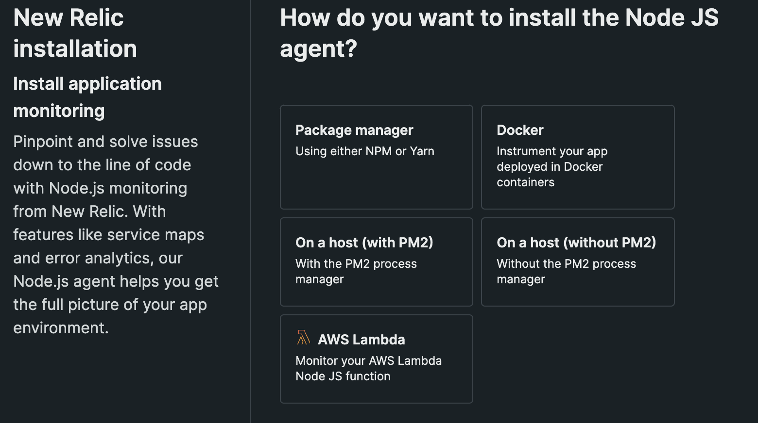 나는 EC2 인스턴스에 PM2로 NodeJS 프로세스를 올리며 관리하고 있다. 그래서 On a host (with PM2)를 선택했다.