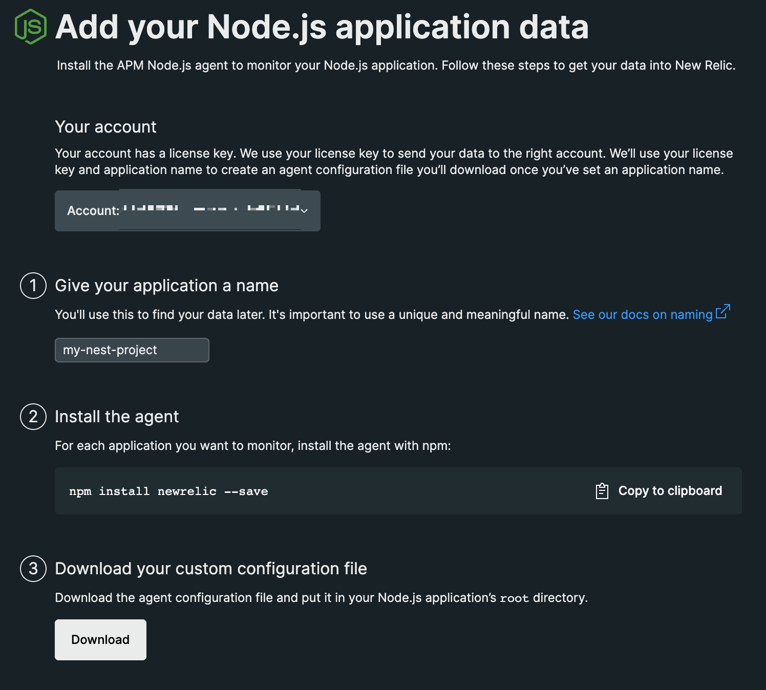 먼저 내 계정을 고른다. 만약 다른 앱(Browser application, Database instance 등)도 newrelic으로 연동된 상태이면 그것을 연동시킨 계정과 똑같은 계정으로 설정하면 된다.