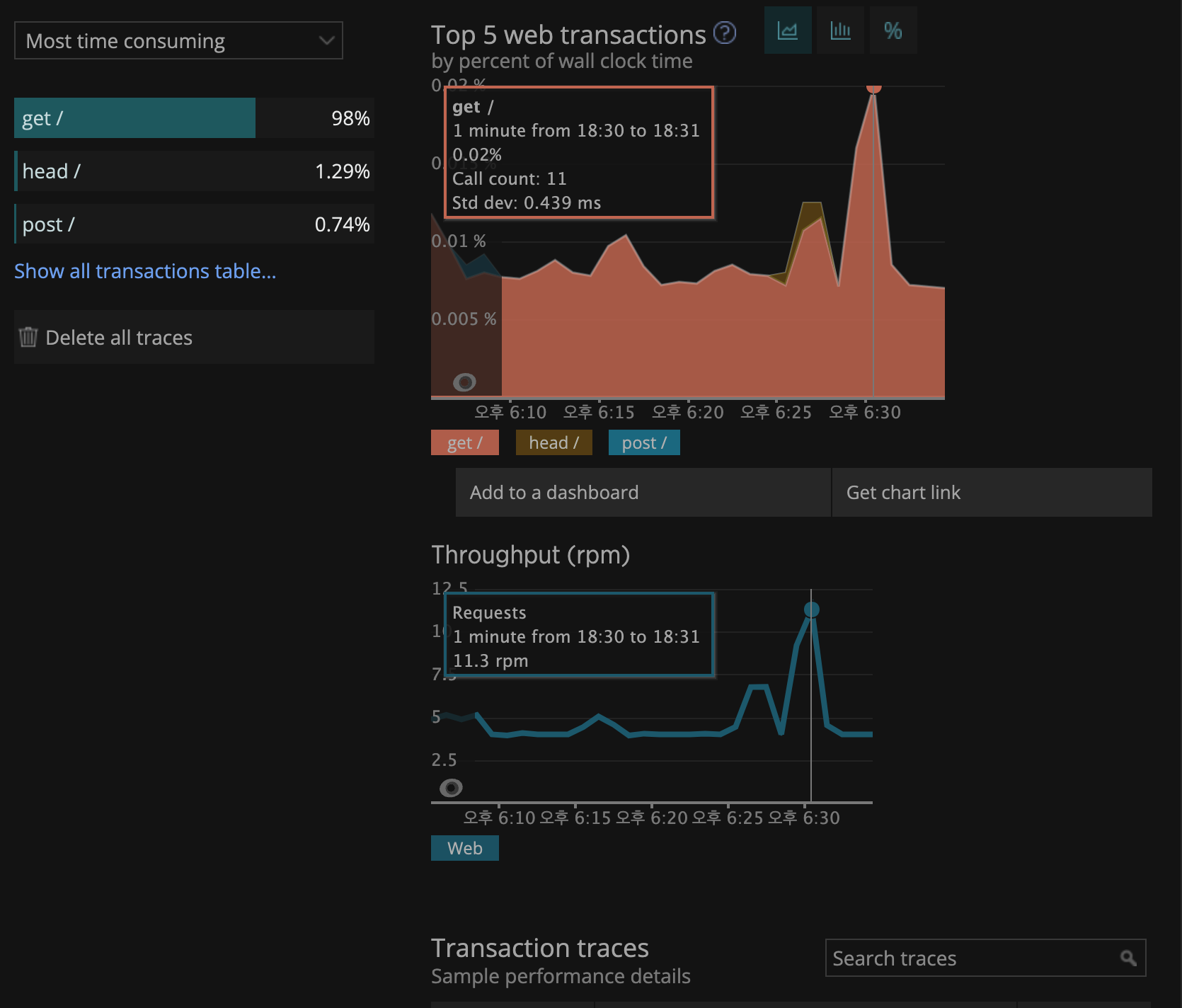 이제 내 앱의 Monitor에 가서 내 데이터들을 구경하면 된다. API를 몇 번 호출해주고 트랜젝션 탭에 가주면 다음과 같이 뜬다.