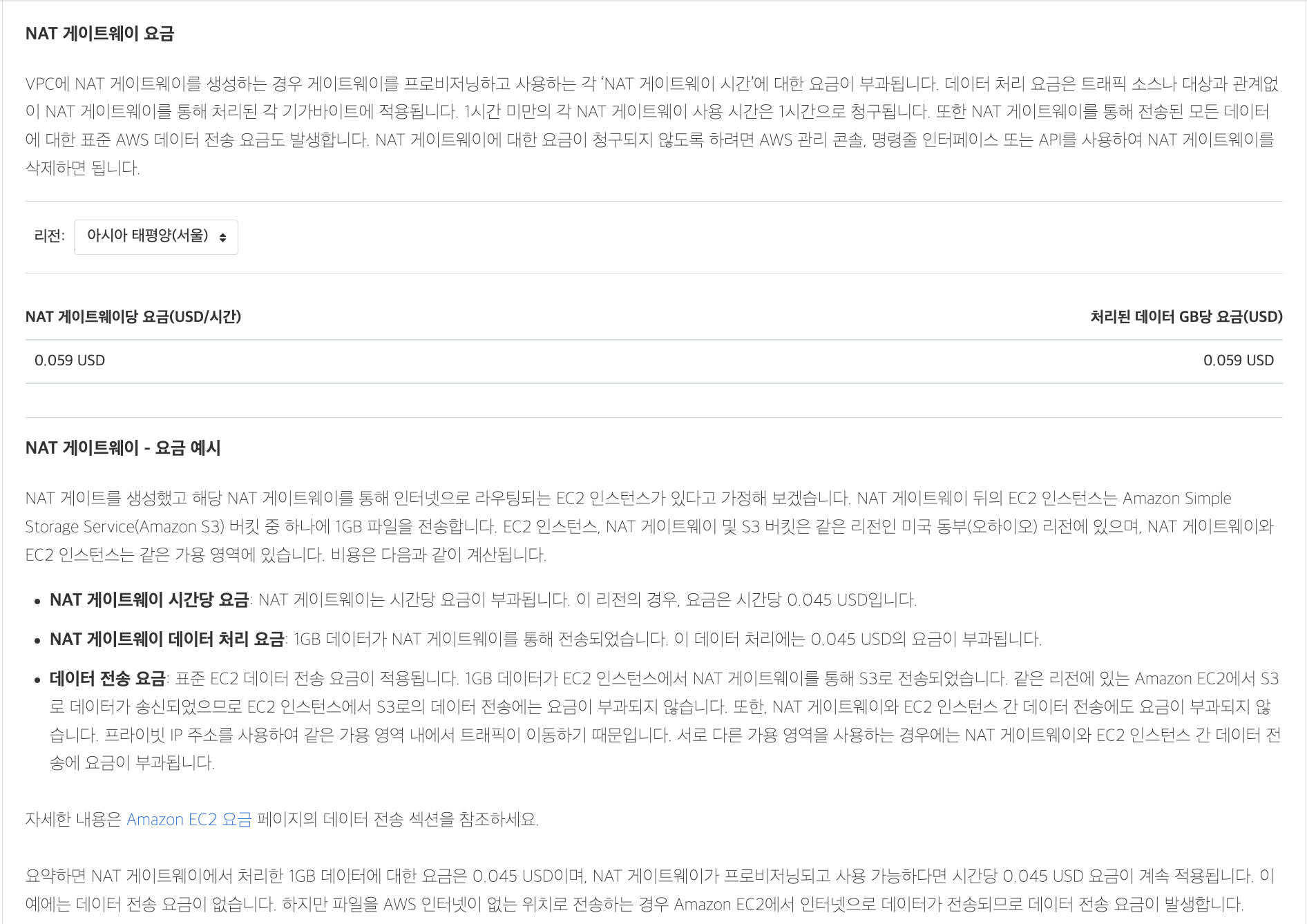 한국은 NAT를 통해 나가는 Out-Bound 트래픽 비용이 시간당 (처리된 GB 당 0.059$)이다.