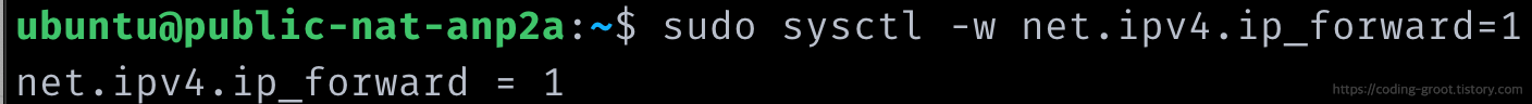 /proc/sys/net/ipv4/ip_forward 값을 1로 바꿔도 되고 위와 같이 명령어로 해도 된다. 하지만 영구적으로 적용되지는 않는다.