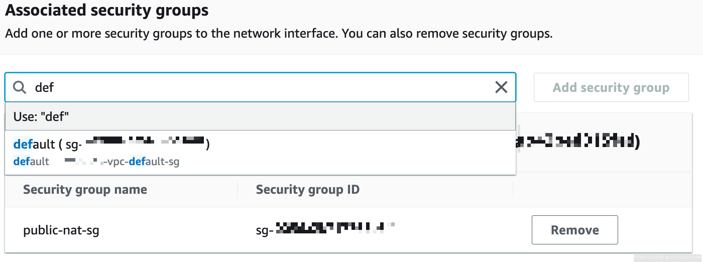 default를 검색해서 선택한 후 Add security group을 누른다.