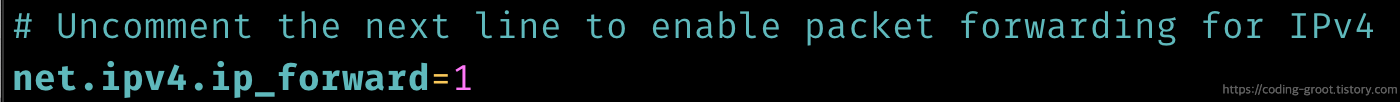 Reboot을 할 때마다 이 설정이 풀리는 것이 싫으면 root권한으로 /etc/sysctl.conf 파일을 열어서 ip_forward 부분의 주석을 해제하고 저장해주자.