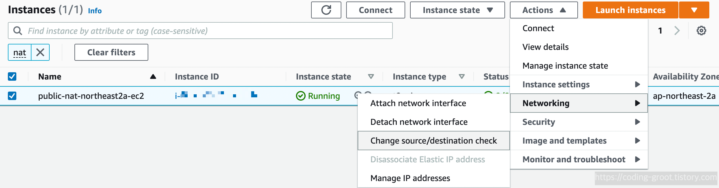 EC2에서 Public NAT용으로 만든 인스턴스를 선택하고 Action > Networing > Change source/desination check을 클릭한다.