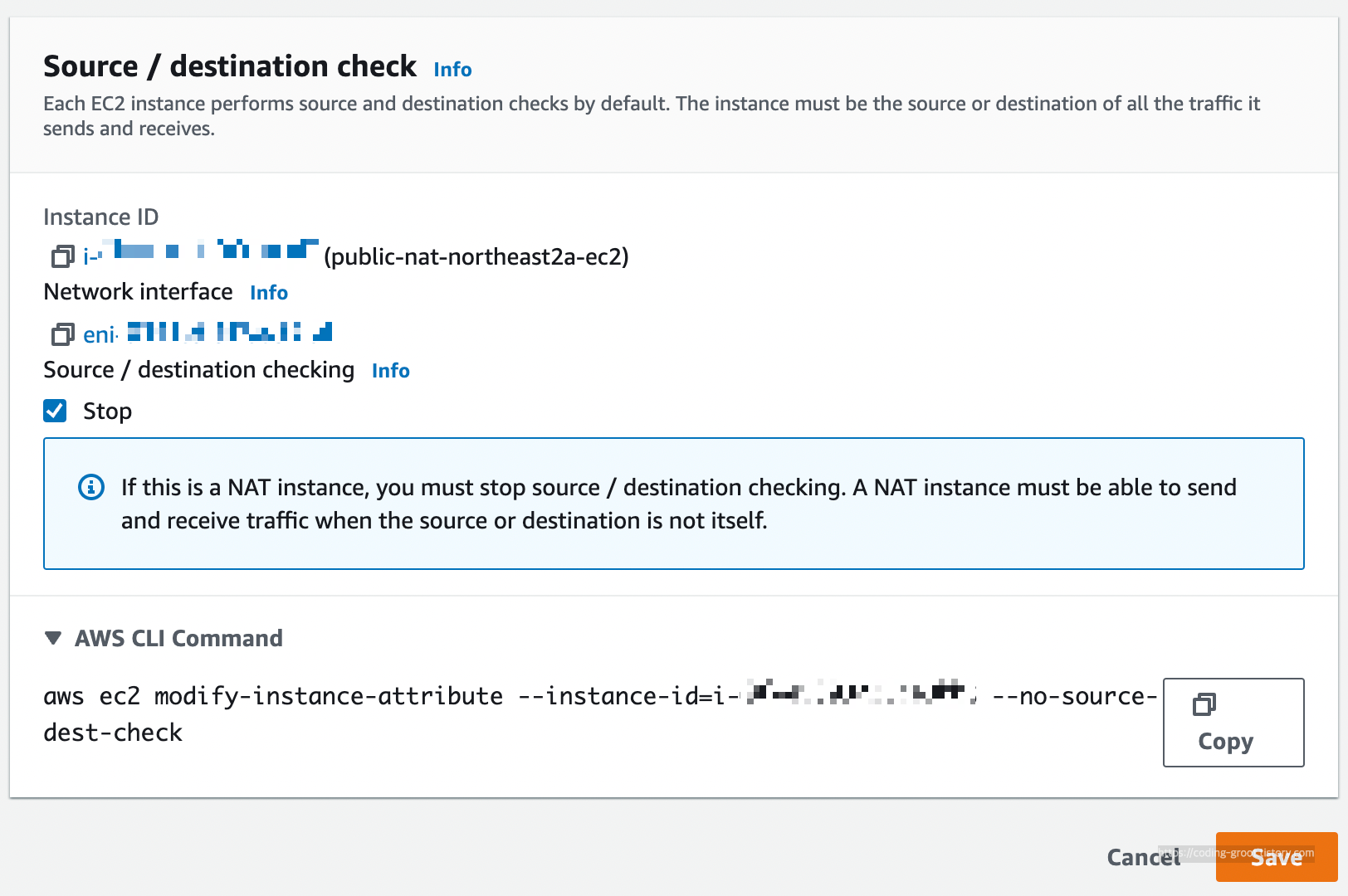 인스턴스를 NAT로 사용하려면 이것을 꺼야 한다. 아니면 모든 것이 잘되어 있어도 이상하게 패킷이 오지 않는다.