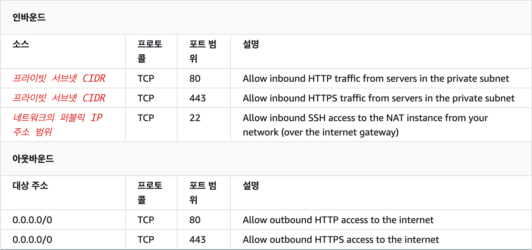 참고로 AWS에서 권장하는 NAT의 Security Group은 다음과 같다.