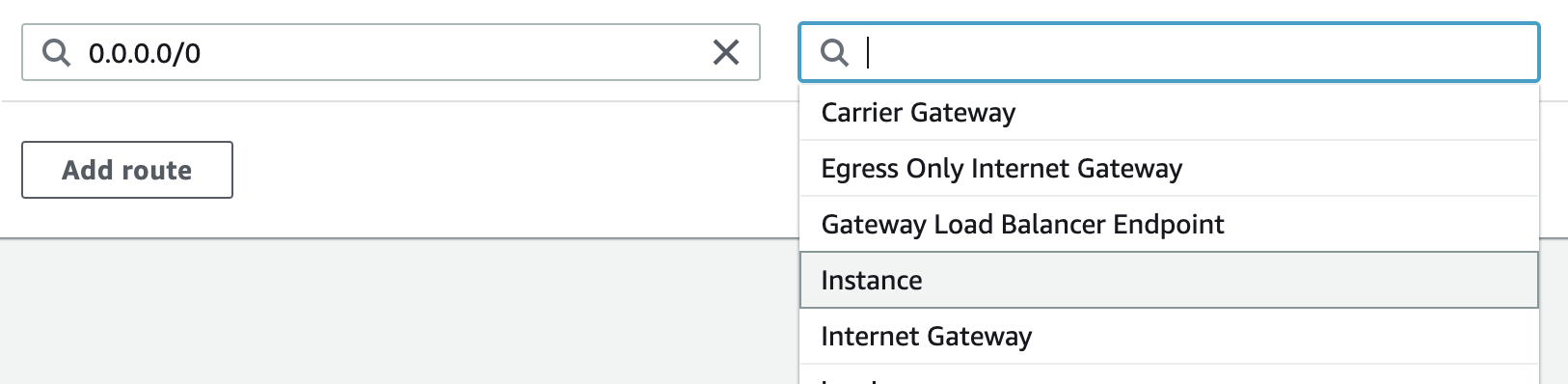 외부 트래픽(0.0.0.0/0)의 Target을 지우고 Instance를 선택한다.