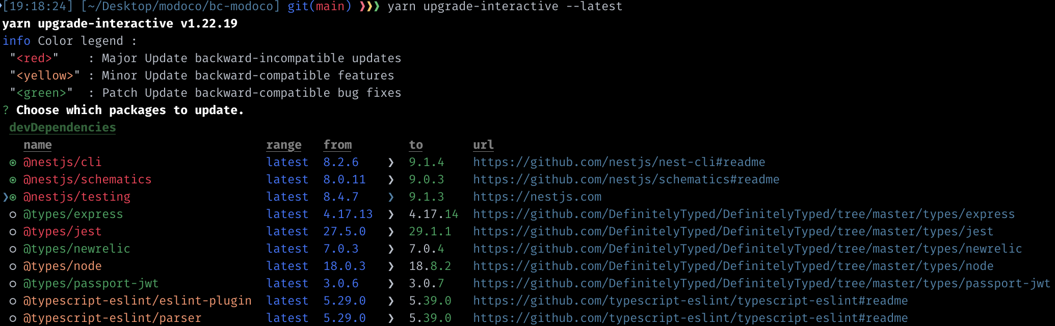 yarn upgrade-interactive 명령어는 yarn outdated와 yarn upgrade를 섞어놓은 버전이다. 그래서 만료된 패키지들을 둘러보고 원하는 패키지를 선택하여 업그레이드를 진행할 수 있다.