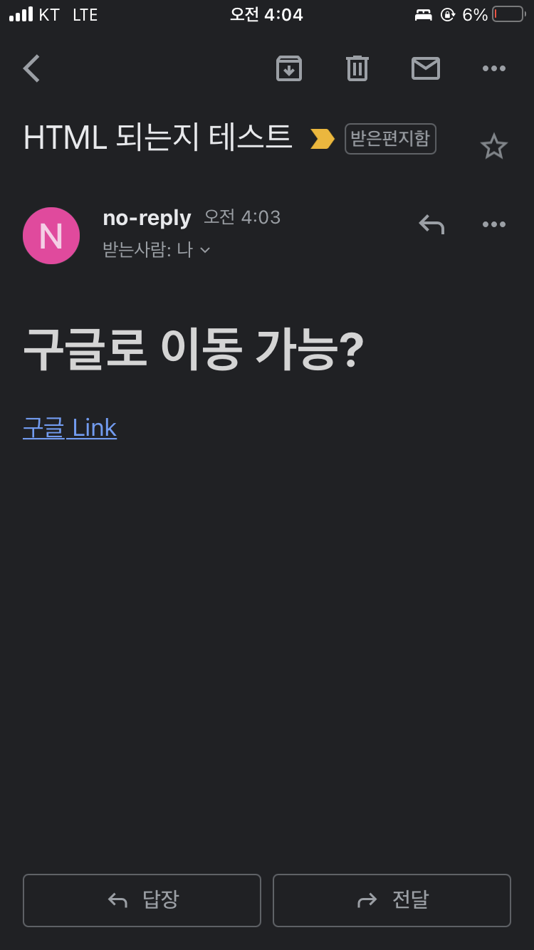 HTML로 보낸 본문도 잘 보내졌습니다. 이처럼 HTML 태그가 인식되어서 링크로 보이는 것을 확인할 수 있습니다. 실제로 눌렀을 때 구글로 잘 이동했습니다.