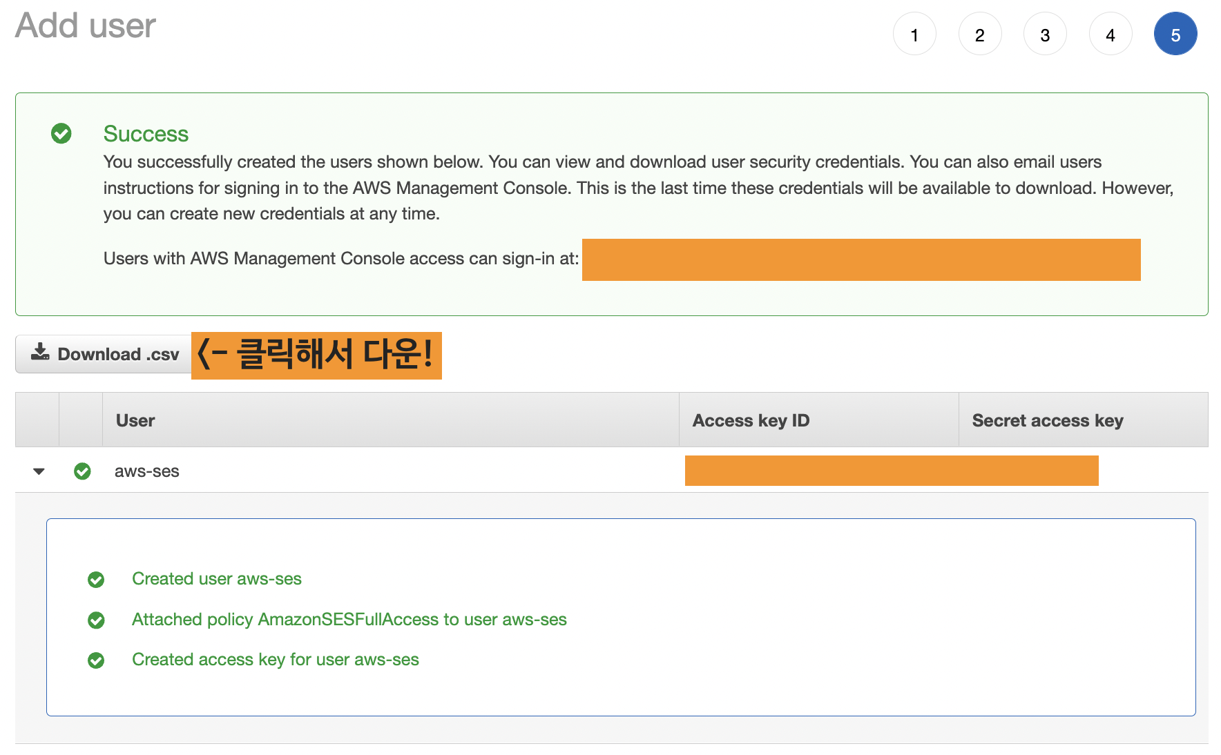 Download .csv 버튼을 눌러서 access key ID와 secret access key를 파일로 다운받습니다.
