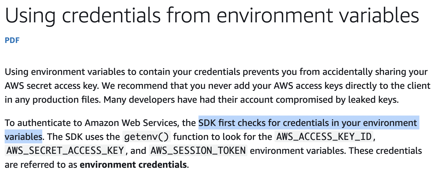 SDK는 먼저 환경 변수를 체크한다고 합니다. 다른 환경에 배포할 때도 환경변수만 세팅해주면 돼서 편하고 파일로 공유하다가 누출되는 사고도 어느정도 방지할 수 있습니다.