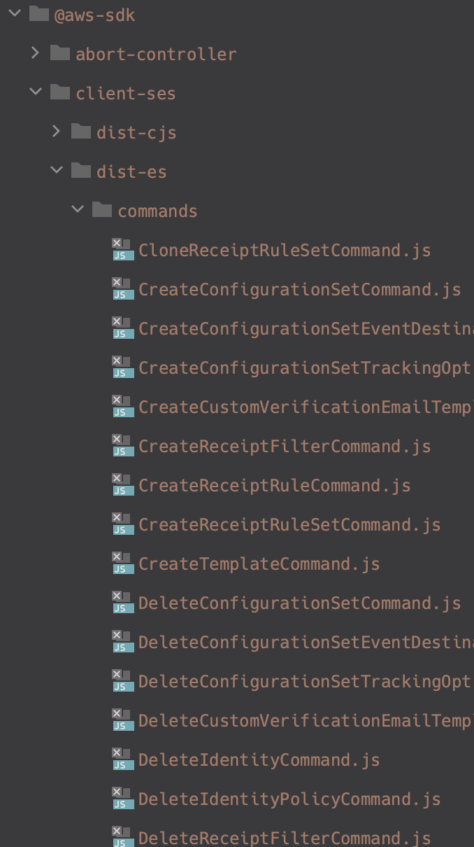 Node에서 V2는 AWS SDK를 전부 (require로) 불러와야 해야 했지만 V3부터는 내가 필요한 명령어만 불러(import) 올 수 있습니다. 이 Client가 제공해주는 명령어는 node-modules/@aws-sdk/client-패키지명/.../명령어-폴더에서 찾을 수 있습니다.