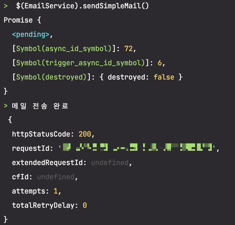 NestJS의 신기능인 REPL로 직접 sendSimpleEmail 함수를 호출해보았습니다. ㅎㅎ