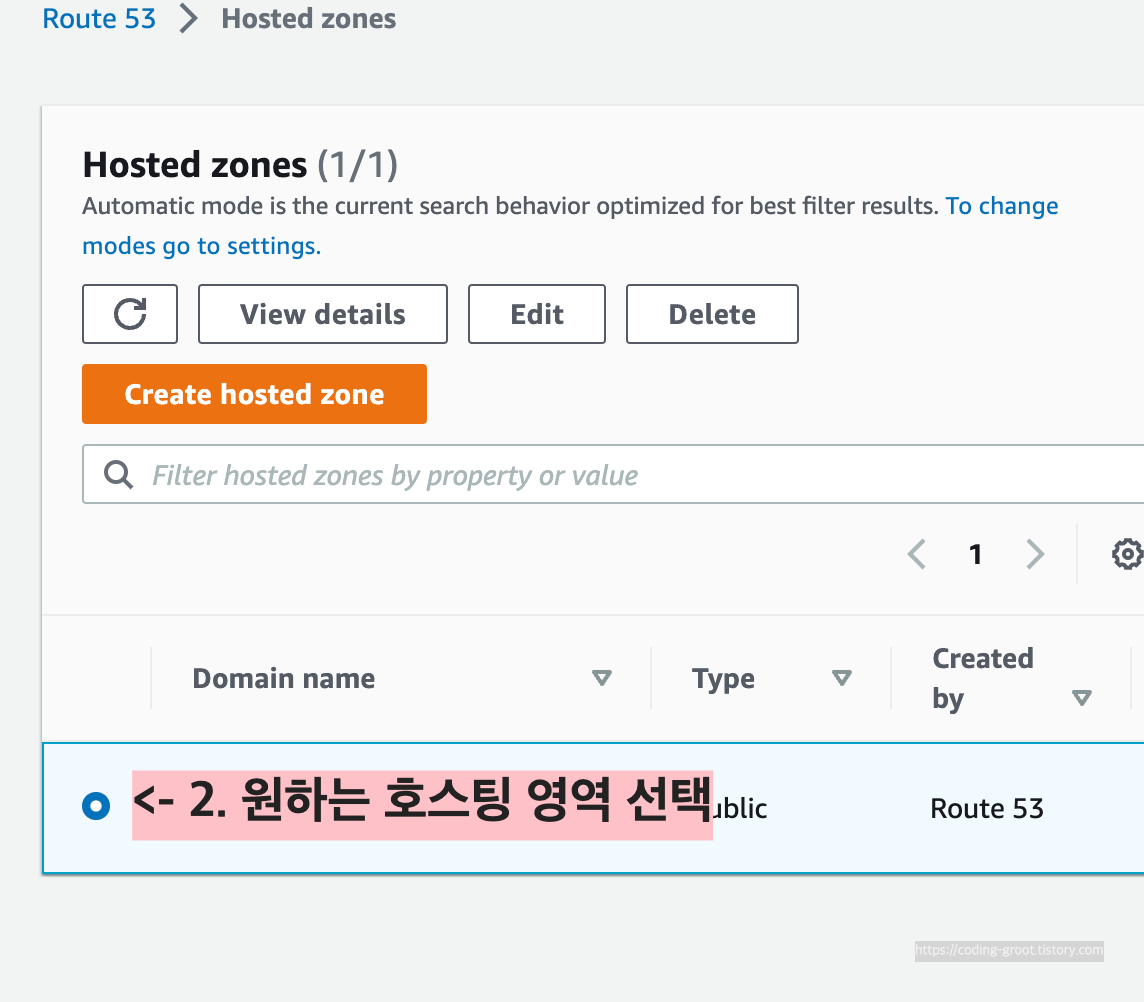 여기에 뜨는 주소가 registered domain의 hosted zone이랑 일치해야 합니다.