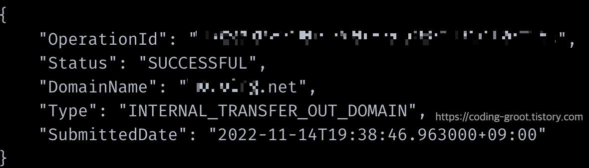 예를 들어서 우리가 도메인 이전 요청을 다른 계정으로 보냈을 때 상대방이 이것을 수락했는지 여부와 이 Operation이 어떤 도메인에 대한 작업인지를 이 명령어를 통해 확인할 수 있습니다.