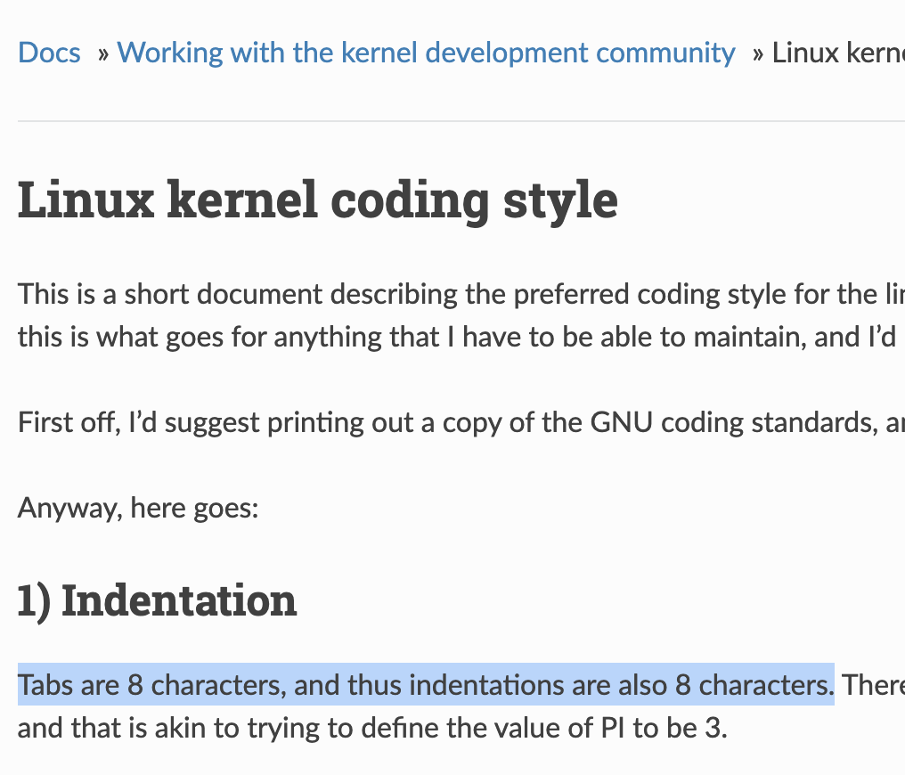 리눅스 커널은 탭 사이즈를 스페이스 8개로 권장합니다.