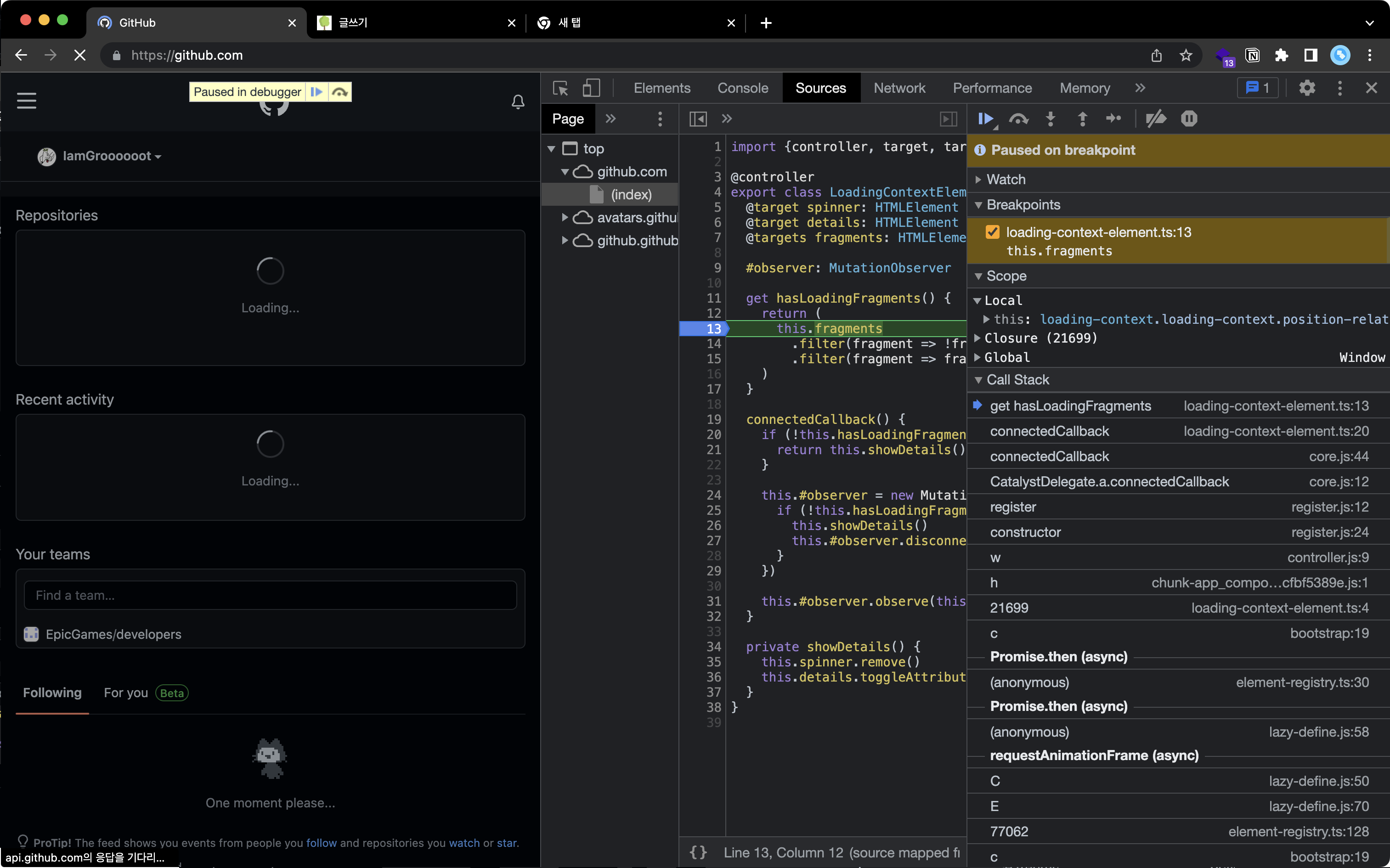 저는 디버거로 GitHub을 살펴보았습니다. GitHub가 리액트 같은 라이브러리를 안 쓰고 순수하게 JavaScript의 WebComponent를 사용해서 개발한 사이트로 유명합니다. 물론 쌩으로 쓰진 않고 Lit와 같은 라이브러리를 사용합니다.