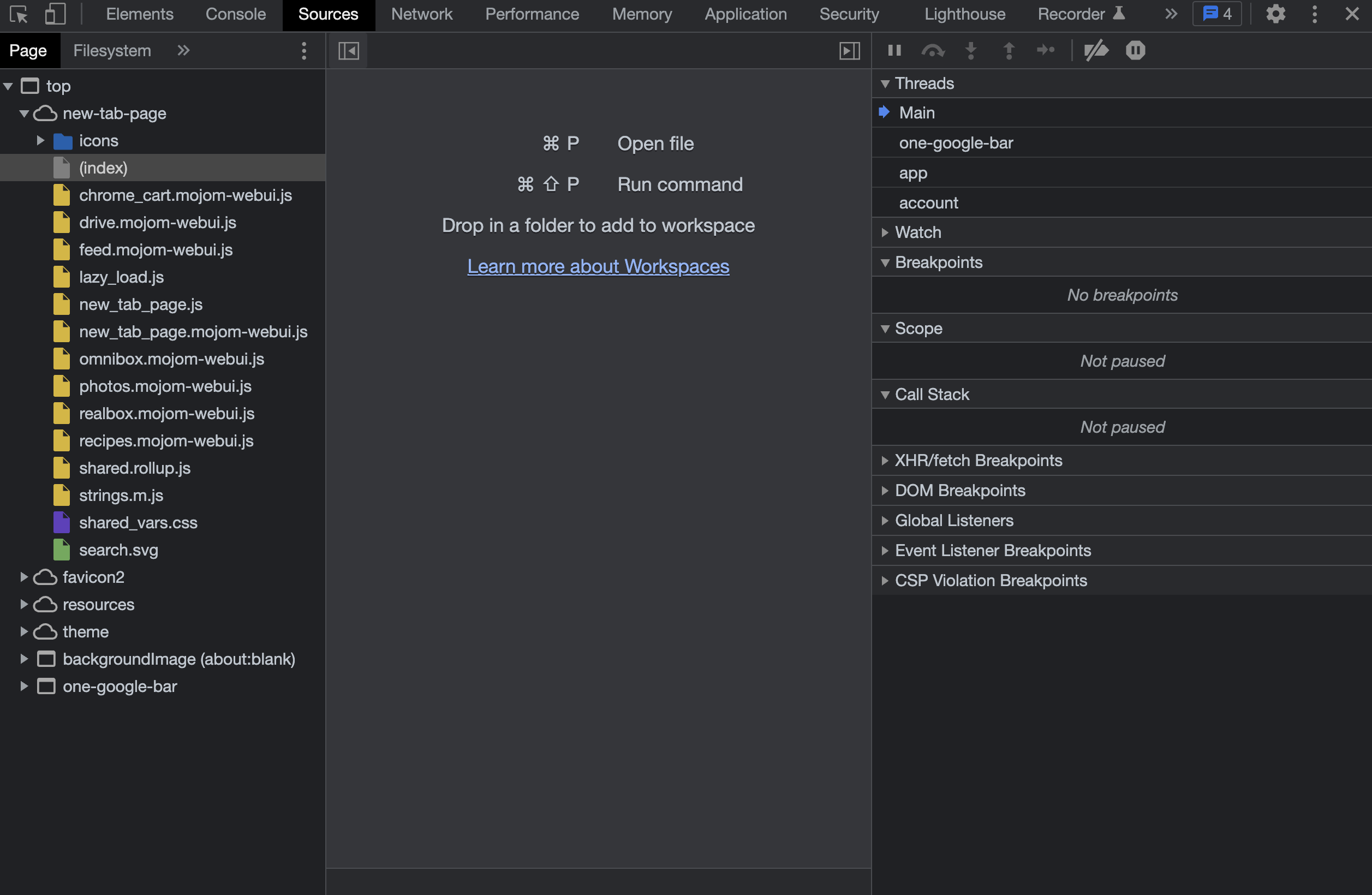 왼쪽 탭을 보시면 Thread, Watch, Breakpoints, Scope, Call Stack, 등의 익숙한 용어들이 보입니다.