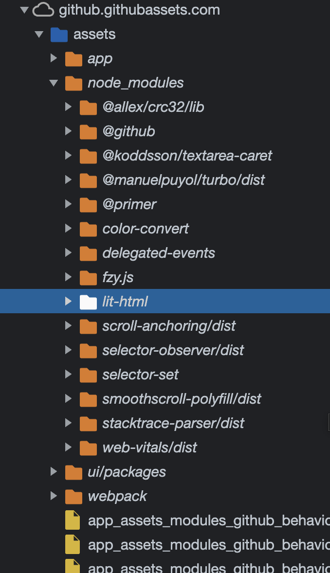 저는 디버거로 GitHub을 살펴보았습니다. GitHub가 리액트 같은 라이브러리를 안 쓰고 순수하게 JavaScript의 WebComponent를 사용해서 개발한 사이트로 유명합니다. 물론 쌩으로 쓰진 않고 Lit와 같은 라이브러리를 사용합니다.