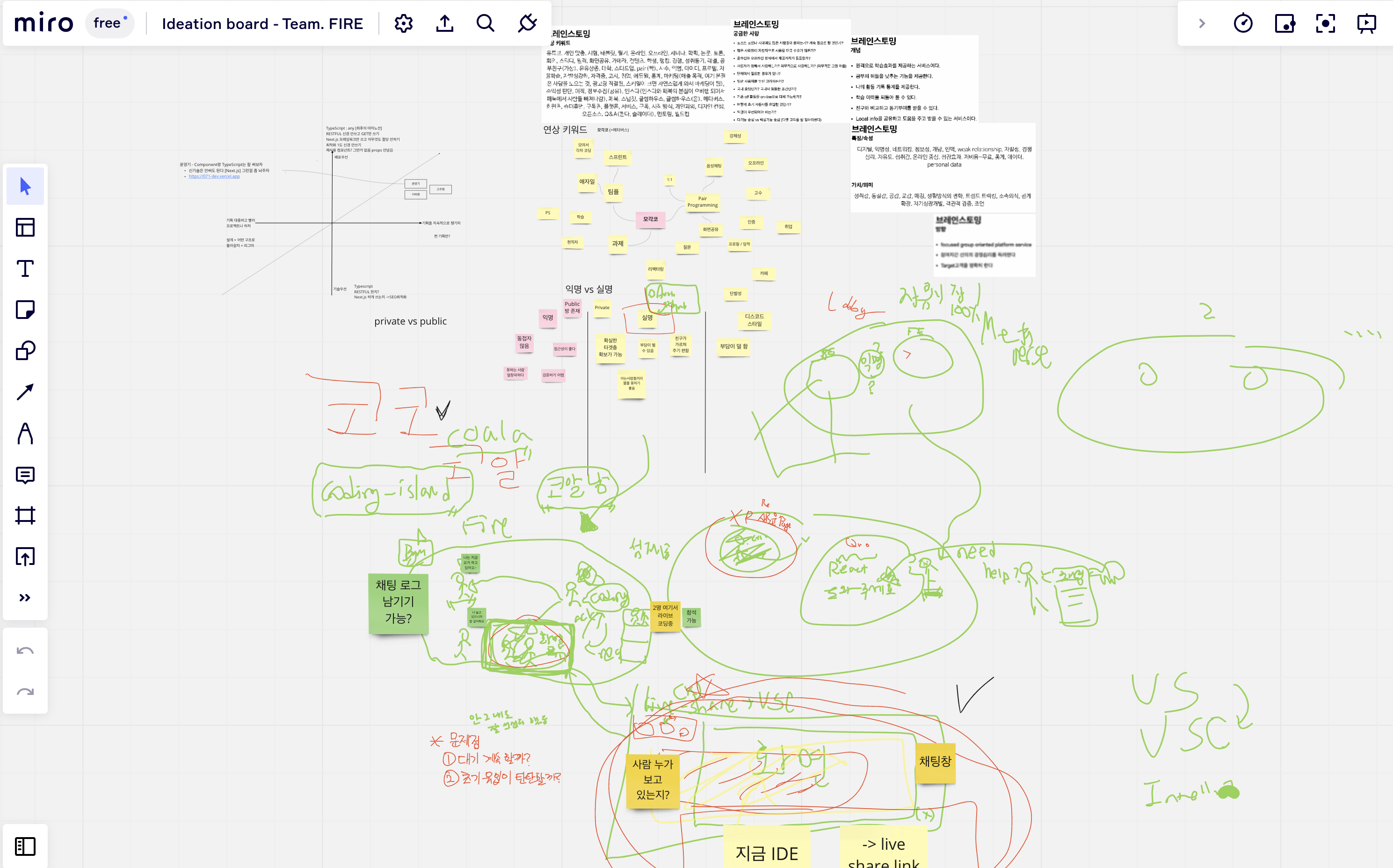 초반에 자료 조사, 문제 정의, 어떤 의도를 가지고 제안했는지 등, 기획을 문서화하기 위해 노션을 사용했다. 서로 얘기하며 추상적인 아이디어를 정리할 때는 Miro를 많이 애용했다.