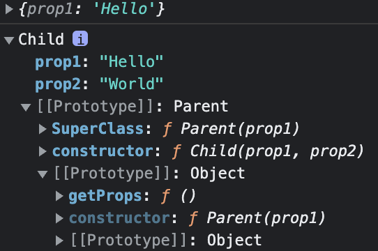 this.SuperClass(prop1); // == this.prop1 = prop1; <- 여기서 this는 생성자의 this이므로 클래스 인스턴스가 된다.