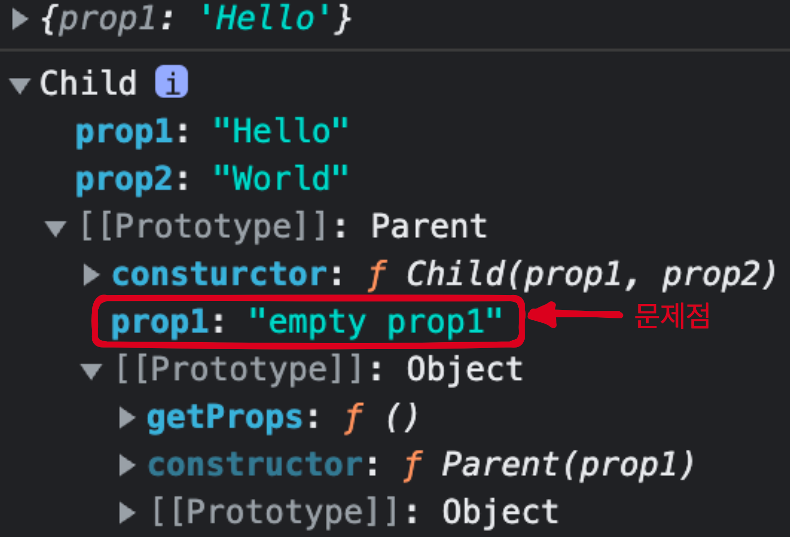 자식에서 prop1이 지워진 경우 이상한 동작을 할 수 있습니다.