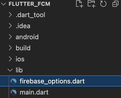 문서에 쓰인대로 프로젝트에 lib 디렉터리를 가보면 firebase_options.dart 파일이 생성된 모습을 확인할 수 있다.