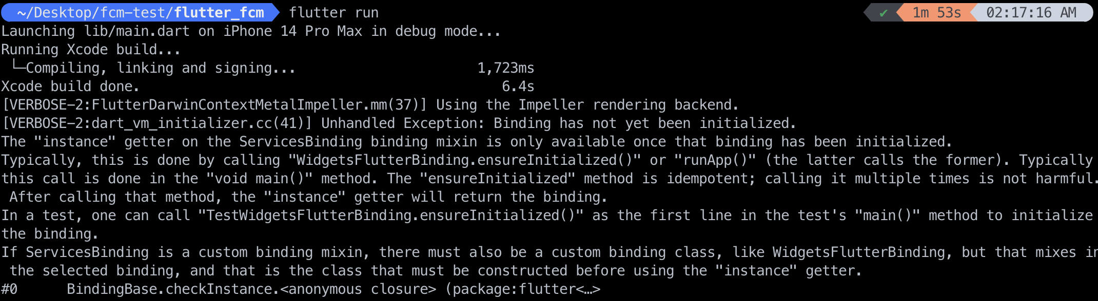 runApp 전에 플러그인 쓰려면 WidgetsFlutterBinding.ensureInitialized() 메서드를 먼저 호출해줘야 하기 때문에 그 코드도 추가해준다.
